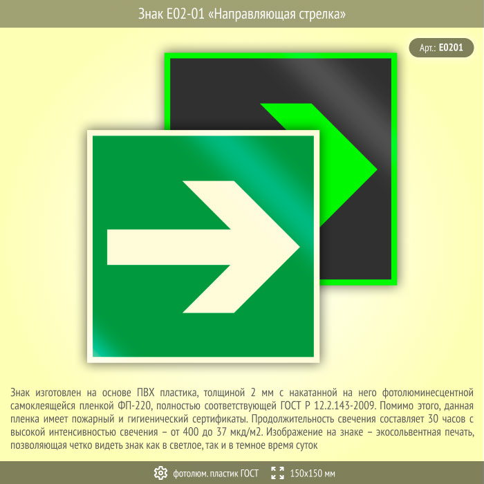 Знак E02-01 «Направляющая стрелка» (фотолюминесцентный пластик ГОСТ 34428-2018, 150х150 мм) в Москве купить