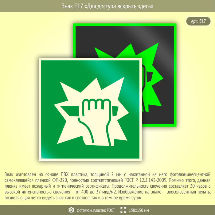 Знак E17 «Для доступа вскрыть здесь» (фотолюминесцентный пластик ГОСТ 34428-2018, 150х150 мм) в Москве купить
