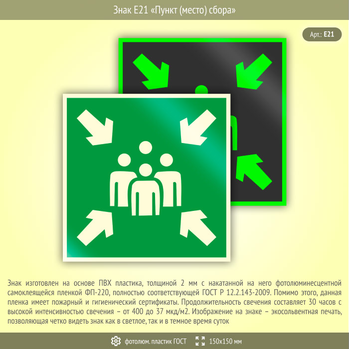 Знак E21 «Пункт (место) сбора» (фотолюминесцентный пластик ГОСТ 34428-2018, 150х150 мм) в Москве купить
