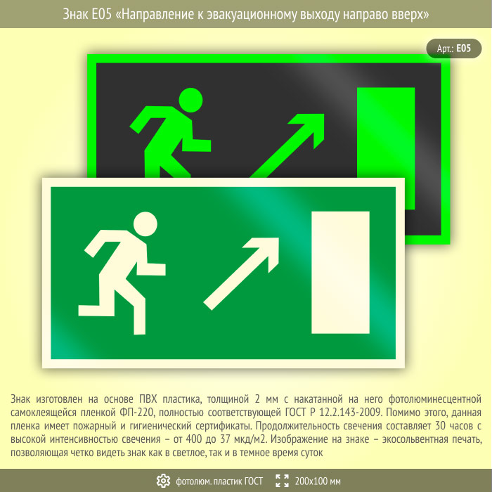 Знак E05 «Направление к эвакуационному выходу направо вверх» (фотолюминесцентный пластик ГОСТ 34428-2018, 200х100 мм) в Москве купить