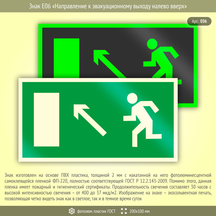 Знак E06 «Направление к эвакуационному выходу налево вверх» (фотолюминесцентный пластик ГОСТ 34428-2018, 200х100 мм) в Москве купить
