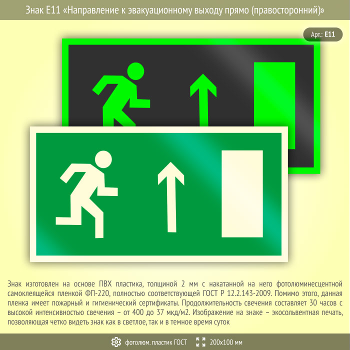 Знак E11 «Направление к эвакуационному выходу прямо (правосторонний)» (фотолюминесцентный пластик ГОСТ 34428-2018, 200х100 мм) в Москве купить
