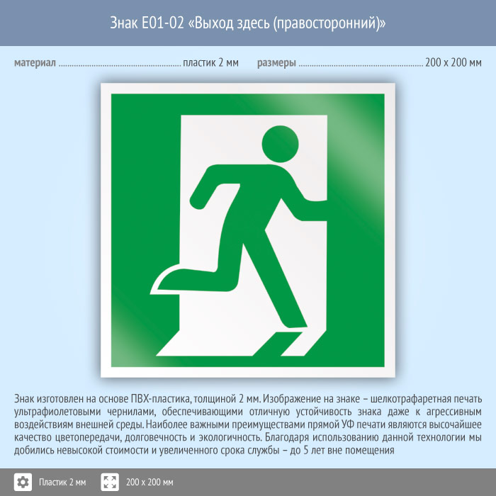 Знак E01-02 «Выход здесь (правосторонний)» (пластик, 200х200 мм) в Москве купить