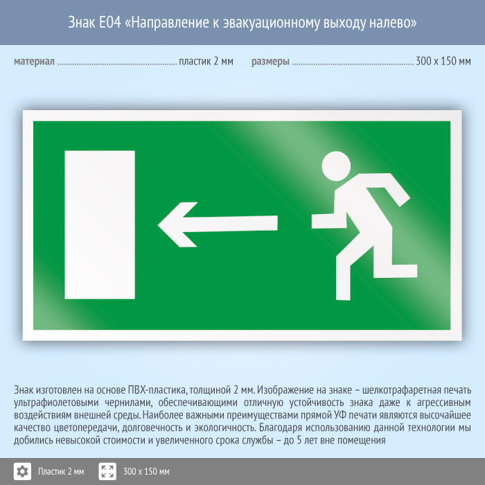 Знак E04 «Направление к эвакуационному выходу налево» (пластик, 300х150 мм) в Москве купить