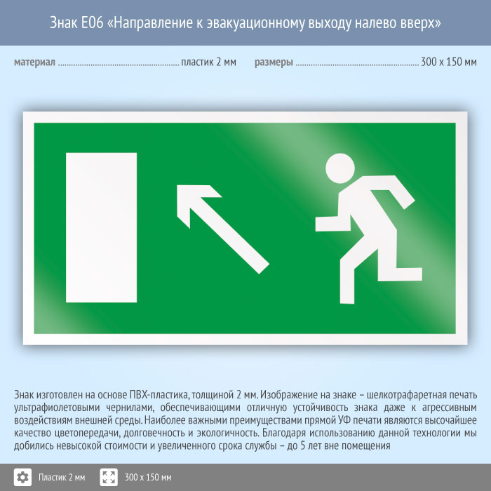 Знак E06 «Направление к эвакуационному выходу налево вверх» (пластик, 300х150 мм) в Москве купить