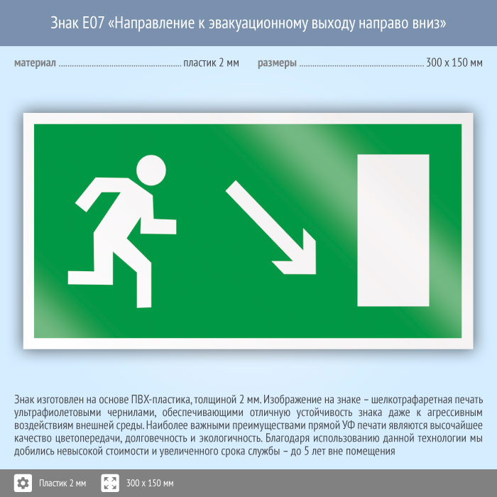 Знак E07 «Направление к эвакуационному выходу направо вниз» (пластик, 300х150 мм) в Москве купить