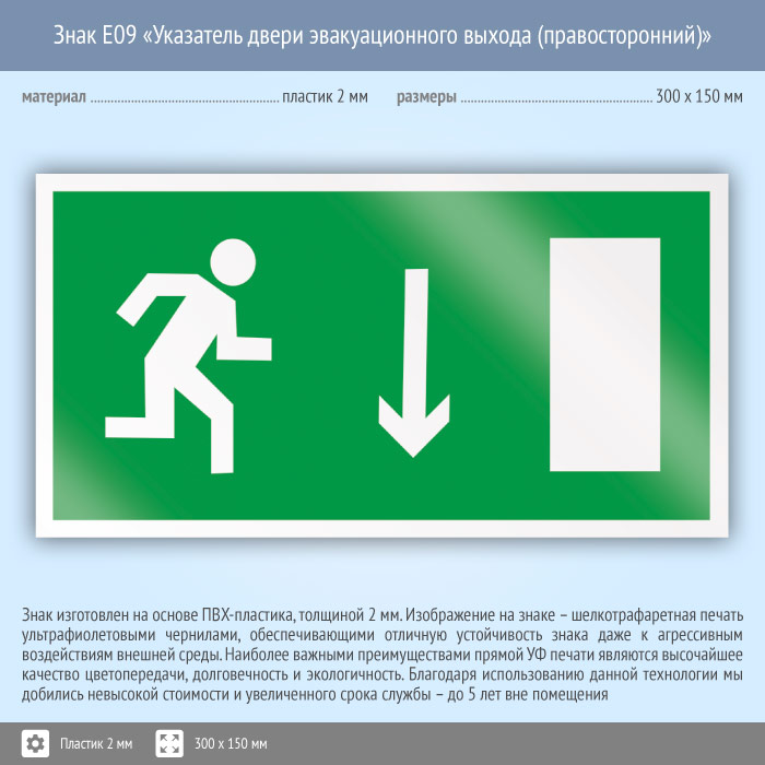 Знак E09 «Указатель двери эвакуационного выхода (правосторонний)» (пластик, 300х150 мм) в Москве купить