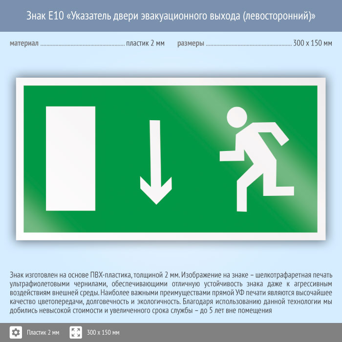 Знак E10 «Указатель двери эвакуационного выхода (левосторонний)» (пластик, 300х150 мм) в Москве купить