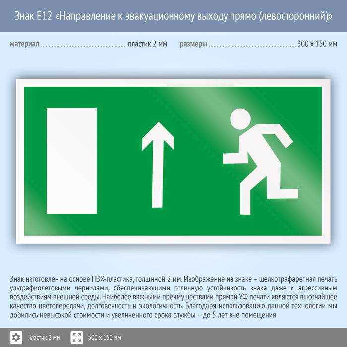 Знак E12 «Направление к эвакуационному выходу прямо (левосторонний)» (пластик, 300х150 мм) в Москве купить