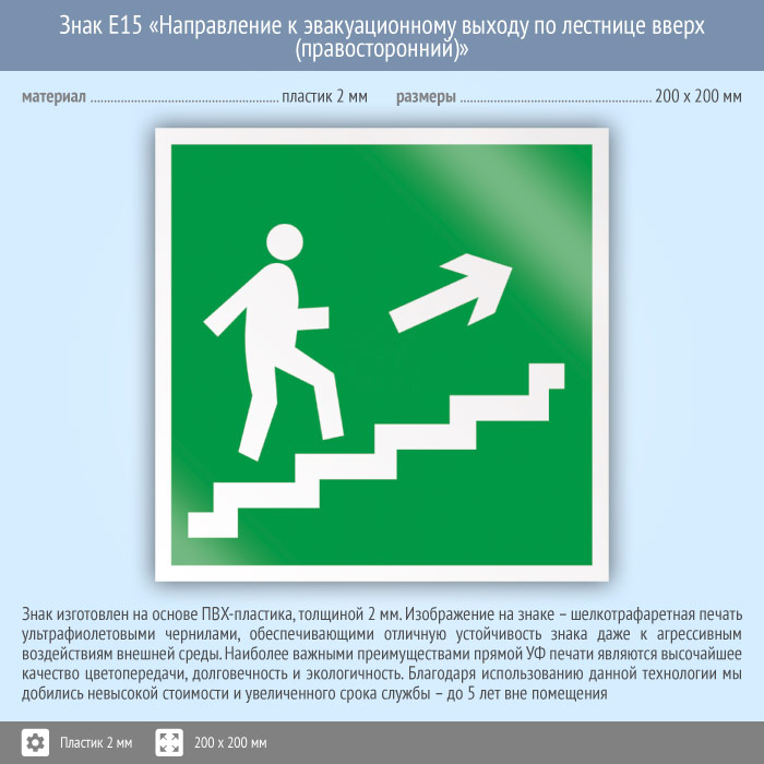 Знак E15 «Направление к эвакуационному выходу по лестнице вверх (правосторонний)» (пластик, 200х200 мм) в Москве купить