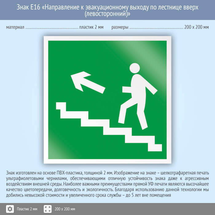 Знак E16 «Направление к эвакуационному выходу по лестнице вверх (левосторонний)» (пластик, 200х200 мм) в Москве купить