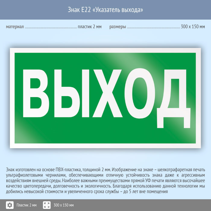 Знак E22 «Указатель выхода» (пластик, 300х150 мм) в Москве купить
