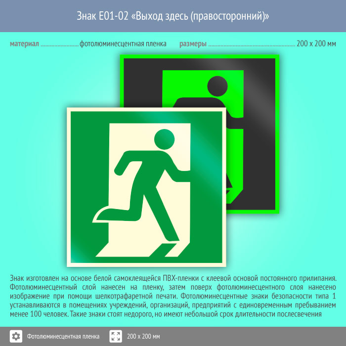 Знак E01-02 «Выход здесь (правосторонний)» (фотолюминесцентная пленка, 200х200 мм) в Москве купить