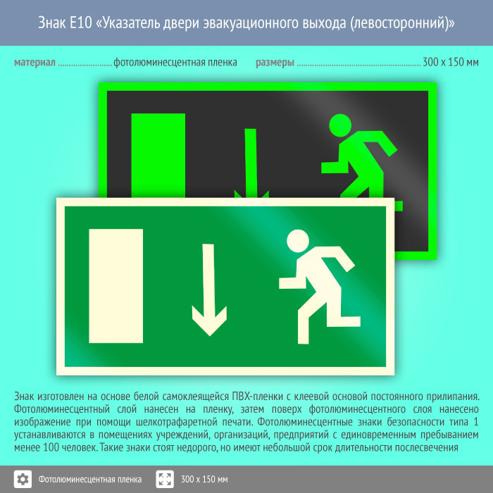 Знак E10 «Указатель двери эвакуационного выхода (левосторонний)» (фотолюминесцентная пленка, 300х150 мм) в Москве купить