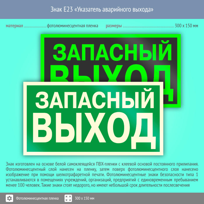 Знак E23 «Указатель запасного выхода» (устаревший) (фотолюминесцентная пленка, 300х150 мм) в Москве купить