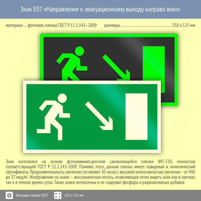 Знак E07 «Направление к эвакуационному выходу направо вниз» (фотолюминесцентная пленка ГОСТ 34428-2018, 250х125 мм) в Москве купить