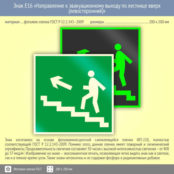 Знак E16 «Направление к эвакуационному выходу по лестнице вверх (левосторонний)» (фотолюминесцентная пленка ГОСТ 34428-2018, 200х200 мм) в Москве купить
