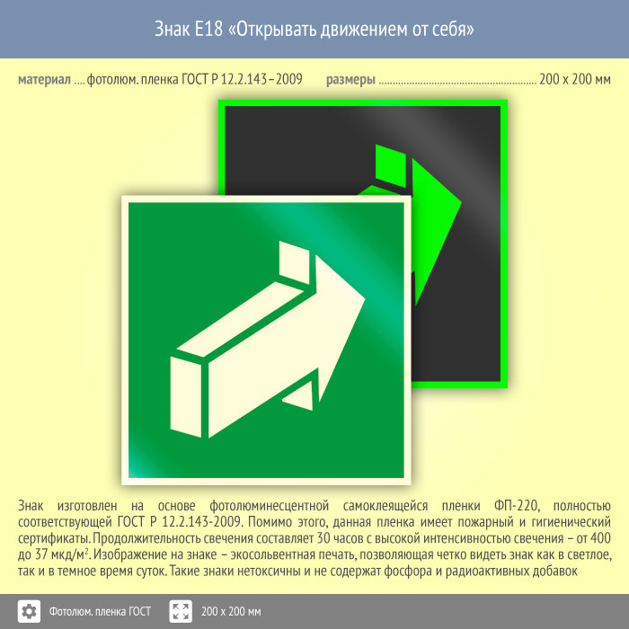 Знак E18 «Открывать движением от себя» (фотолюминесцентная пленка ГОСТ 34428-2018, 200х200 мм) в Москве купить