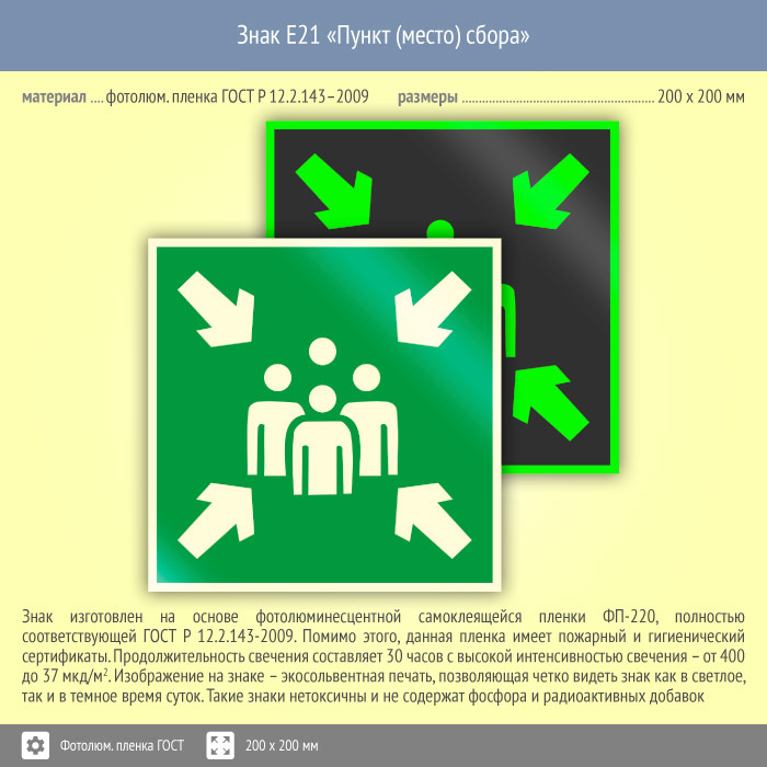 Знак E21 «Пункт (место) сбора» (фотолюминесцентная пленка ГОСТ 34428-2018, 200х200 мм) в Москве купить