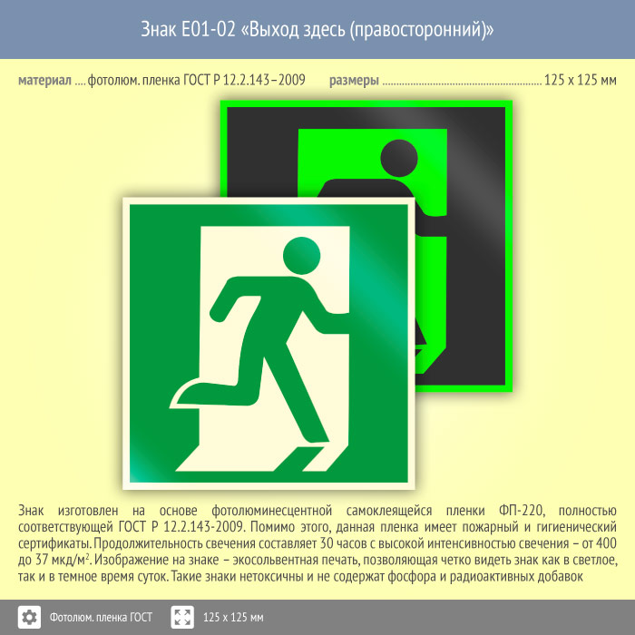 Знак E01-02 «Выход здесь (правосторонний)» (фотолюминесцентная пленка ГОСТ 34428-2018, 125х125 мм) в Москве купить
