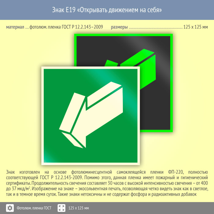 Знак E19 «Открывать движением на себя» (фотолюминесцентная пленка ГОСТ 34428-2018, 125х125 мм) в Москве купить