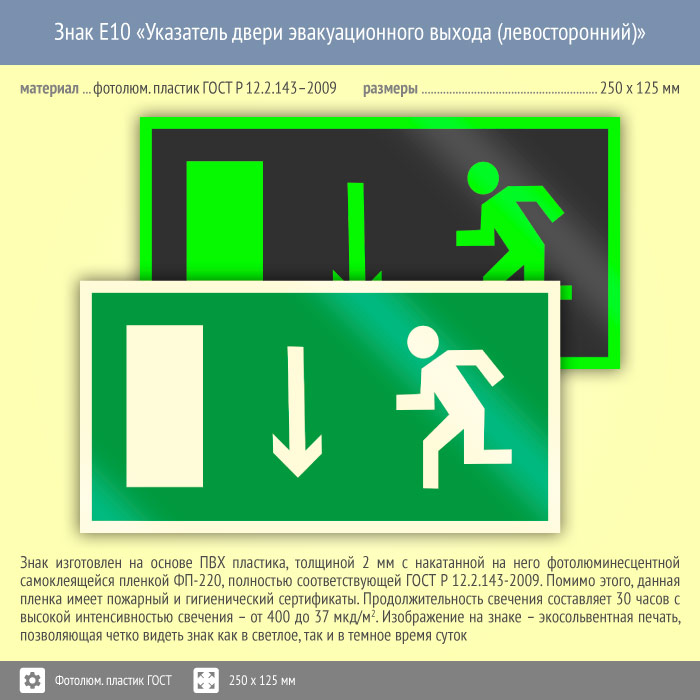 Знак E10 «Указатель двери эвакуационного выхода (левосторонний)» (фотолюминесцентный пластик ГОСТ 34428-2018, 250х125 мм) в Москве купить