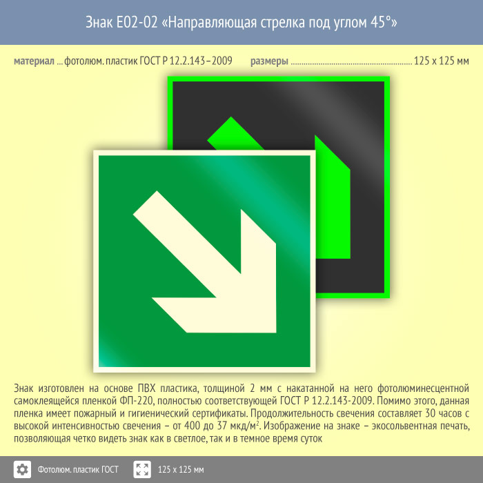 Знак E02-02 «Направляющая стрелка под углом 45°» (фотолюминесцентный пластик ГОСТ 34428-2018, 125х125 мм) в Москве купить