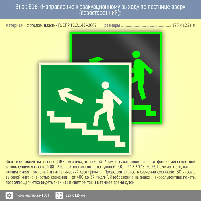 Знак E16 «Направление к эвакуационному выходу по лестнице вверх (левосторонний)» (фотолюминесцентный пластик ГОСТ 34428-2018, 125х125 мм) в Москве купить