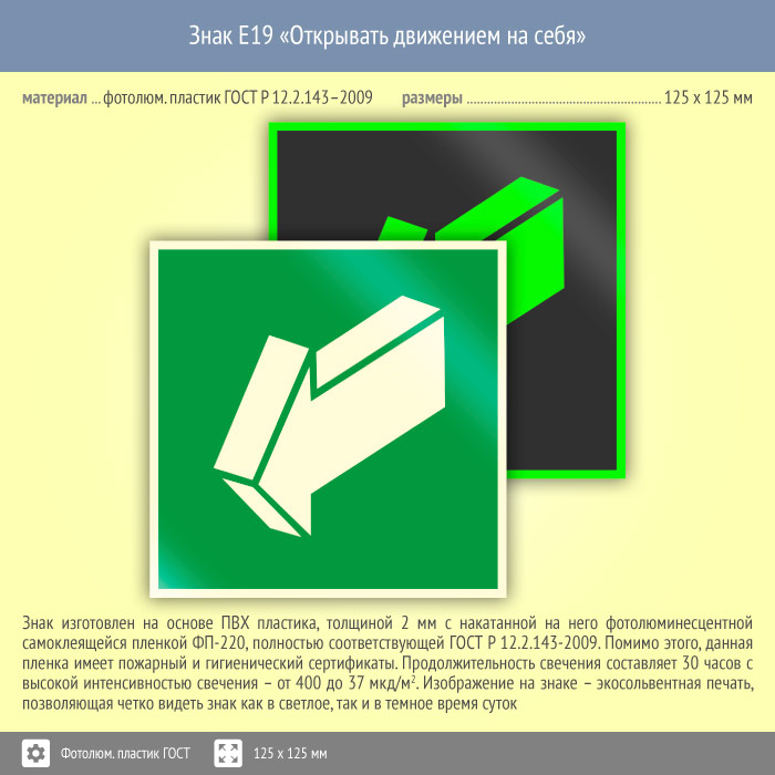 Знак E19 «Открывать движением на себя» (фотолюминесцентный пластик ГОСТ 34428-2018, 125х125 мм) в Москве купить