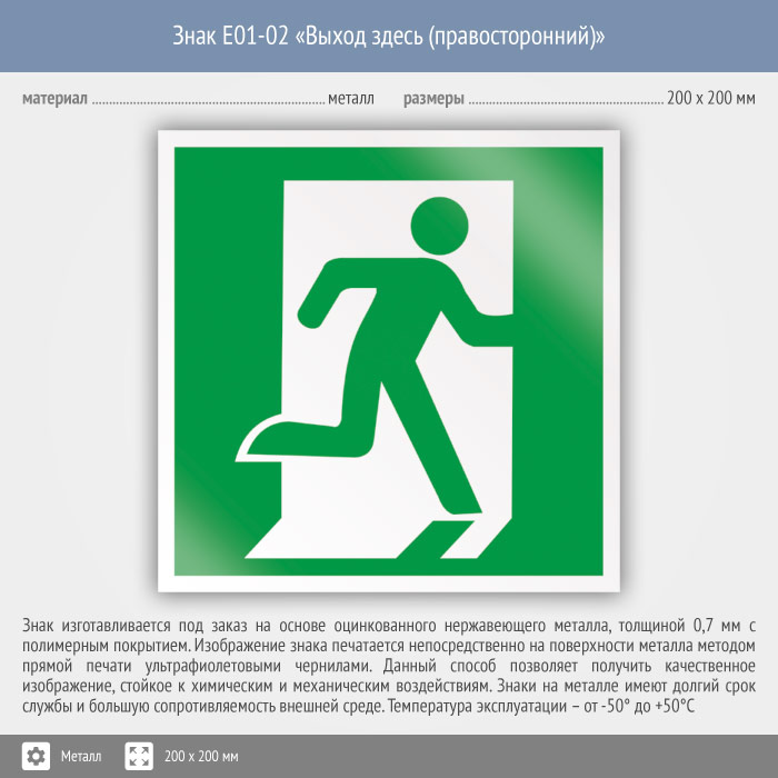 Знак E01-02 «Выход здесь (правосторонний)» (металл, 200х200 мм) в Москве купить