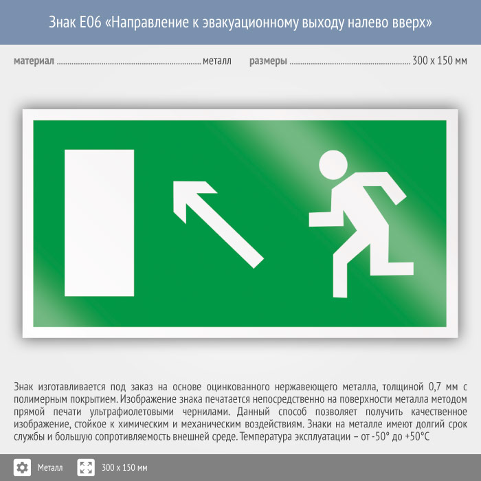 Знак E06 «Направление к эвакуационному выходу налево вверх» (металл, 300х150 мм) в Москве купить