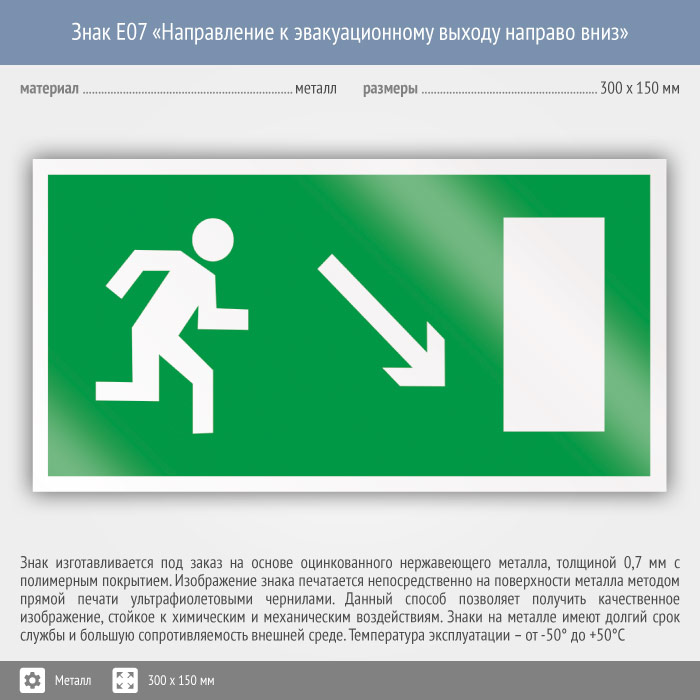 Знак E07 «Направление к эвакуационному выходу направо вниз» (металл, 300х150 мм) в Москве купить