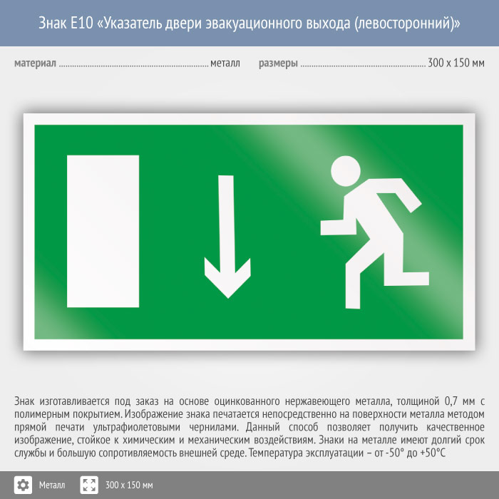 Знак E10 «Указатель двери эвакуационного выхода (левосторонний)» (металл, 300х150 мм) в Москве купить