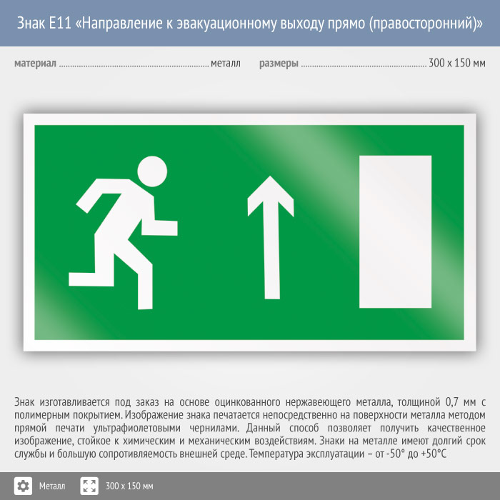 Знак E11 «Направление к эвакуационному выходу прямо (правосторонний)» (металл, 300х150 мм) в Москве купить