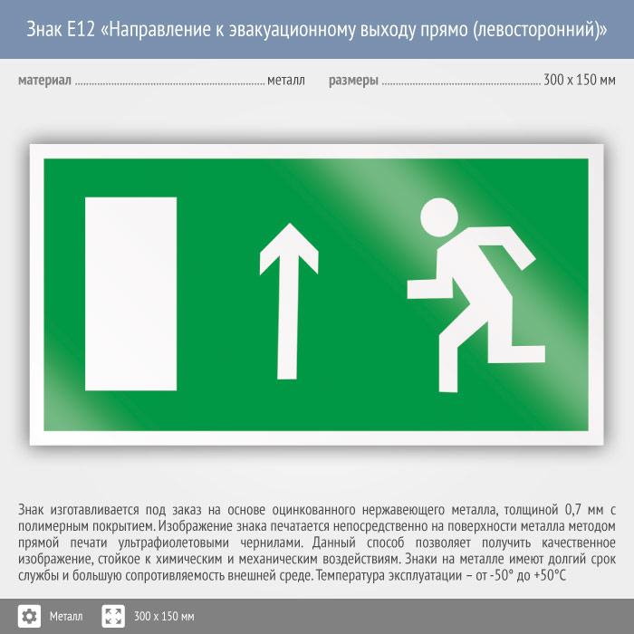 Знак E12 «Направление к эвакуационному выходу прямо (левосторонний)» (металл, 300х150 мм) в Москве купить