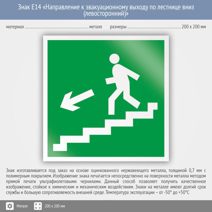 Знак E14 «Направление к эвакуационному выходу по лестнице вниз (левосторонний)» (металл, 200х200 мм) в Москве купить