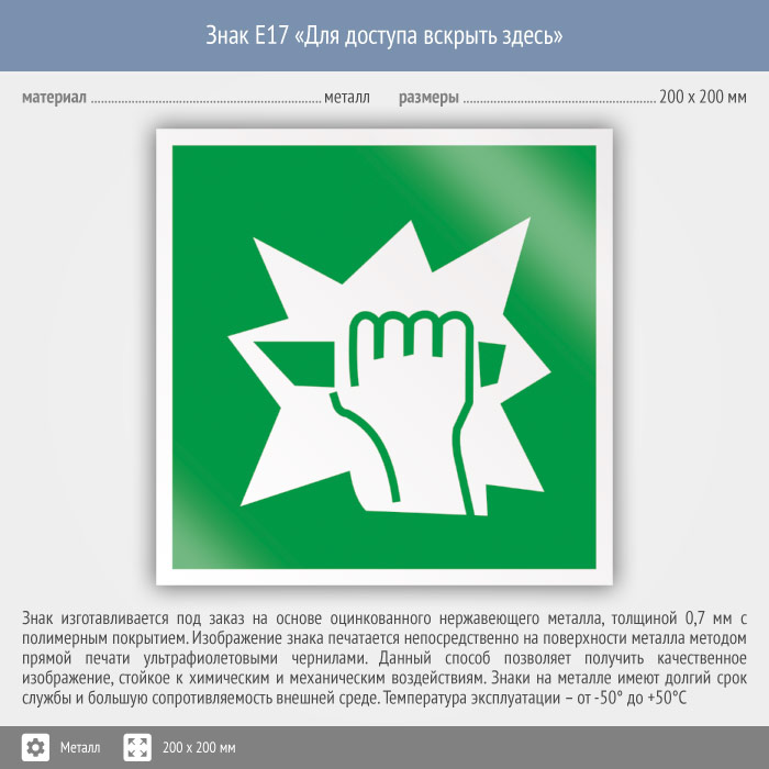 Знак E17 «Для доступа вскрыть здесь» (металл, 200х200 мм) в Москве купить