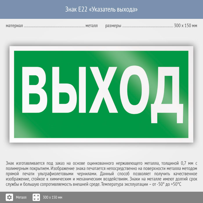 Знак E22 «Указатель выхода» (металл, 300х150 мм) в Москве купить