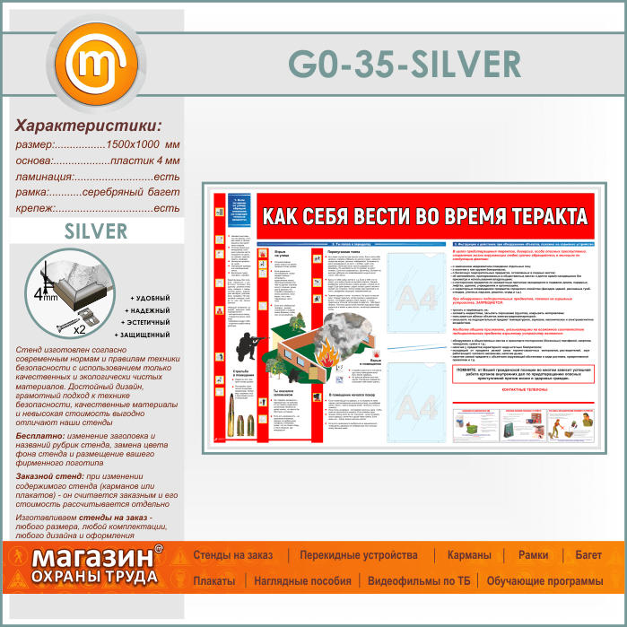 Стенд «Как себя вести во время теракта» c 2 карманами (GO-35-SILVER) в Москве купить