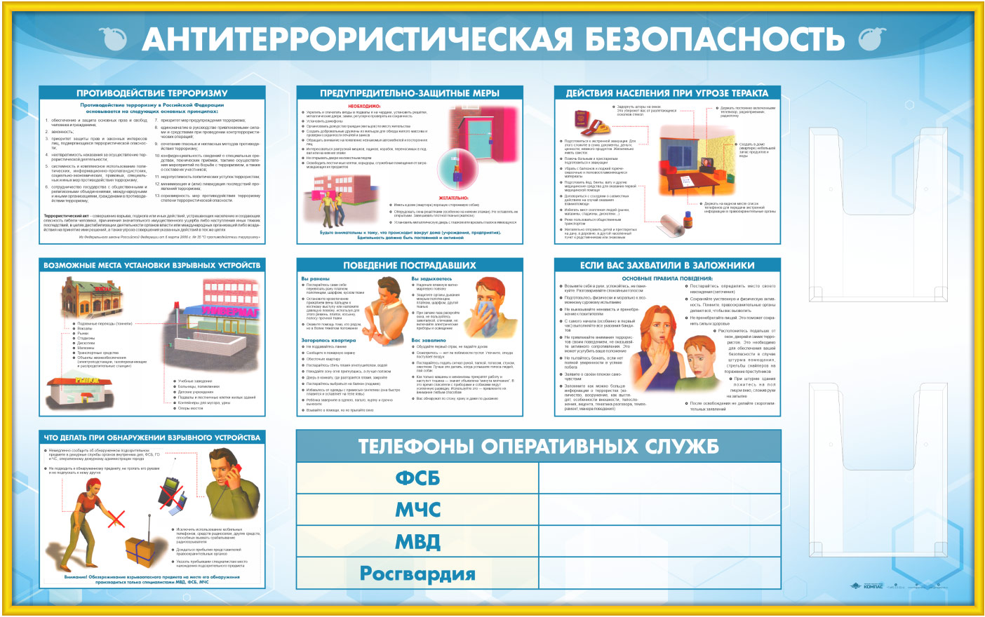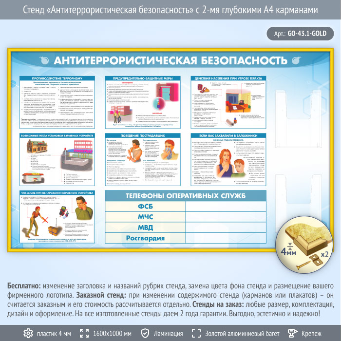 Стенд «Антитеррористическая безопасность» с 2-мя глубокими А4 карманами (GO-43.1-GOLD) в Москве купить