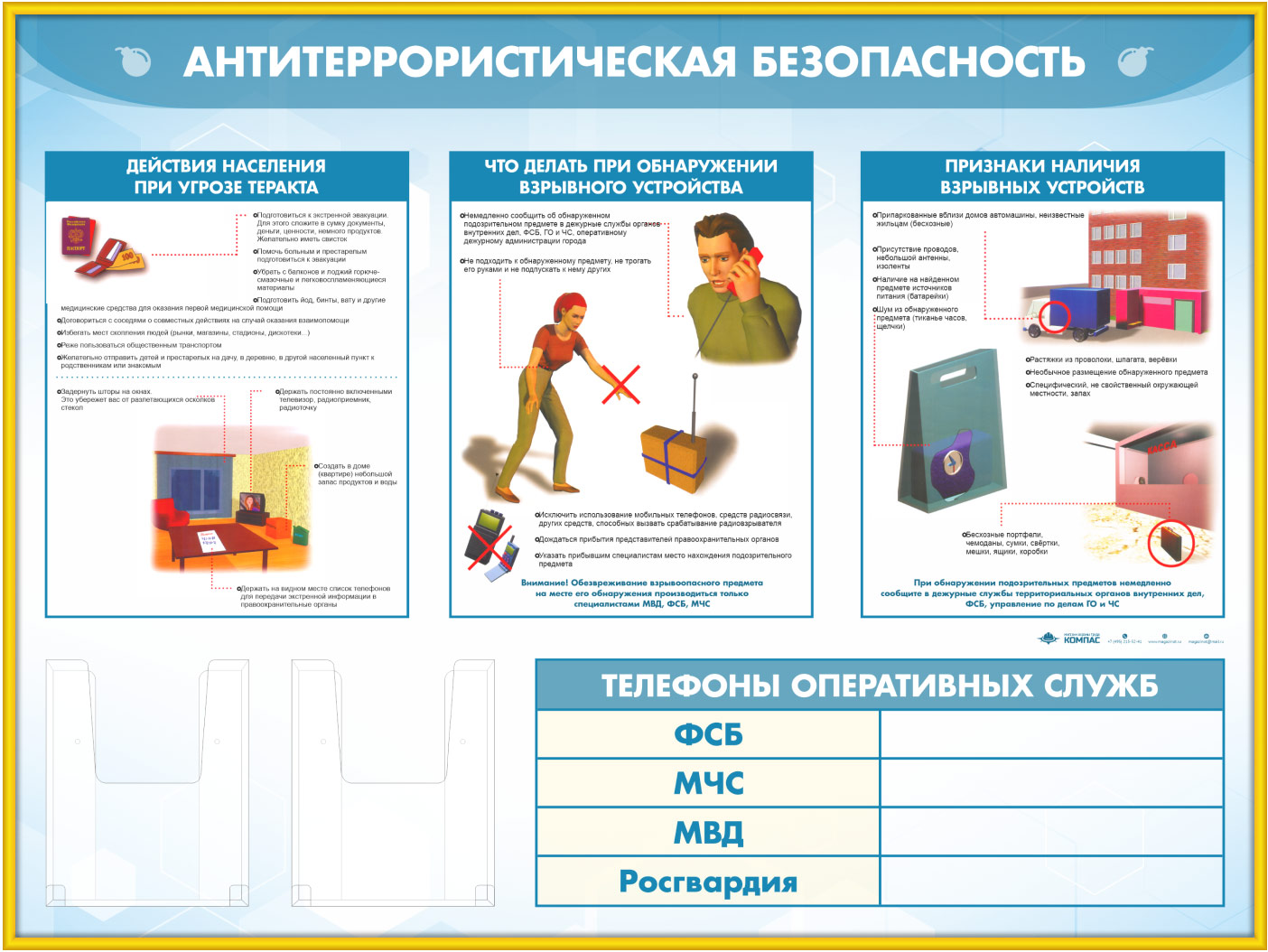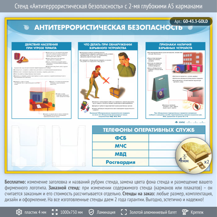 Стенд «Антитеррористическая безопасность» с 2-мя глубокими А5 карманами (GO-43.3-GOLD) в Москве купить