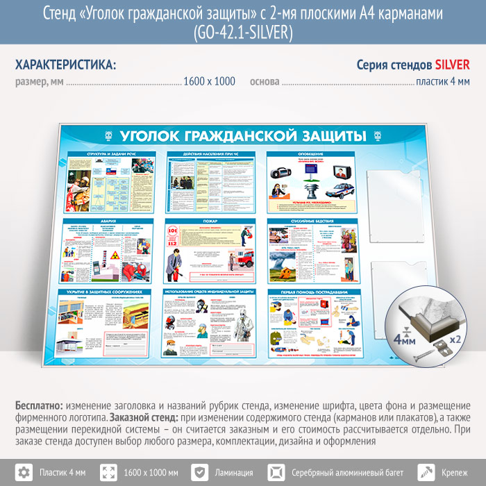 Стенд «Уголок гражданской защиты» с 2-мя плоскими А4 карманами (GO-42.1-SILVER) в Москве купить