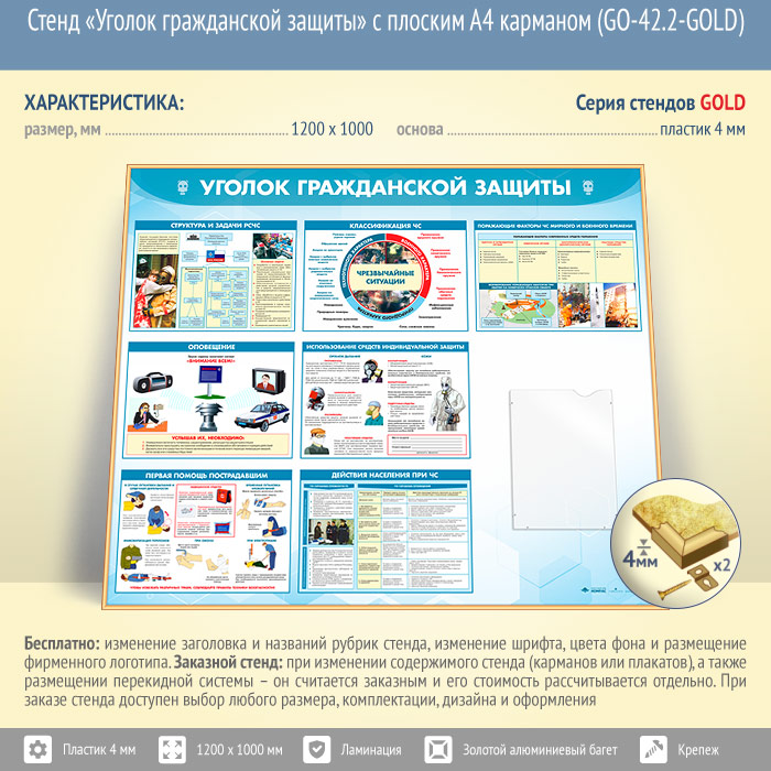 Стенд «Уголок гражданской защиты» с плоским А4 карманом (GO-42.2-GOLD) в Москве купить