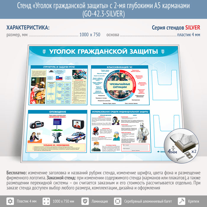 Стенд «Уголок гражданской защиты» с 2-мя глубокими А5 карманами (GO-42.3-SILVER) в Москве купить