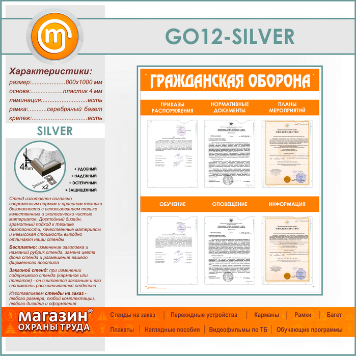 Стенд «Гражданская оборона» с 6 плоскими карманами (GO-12-SILVER) в Москве купить