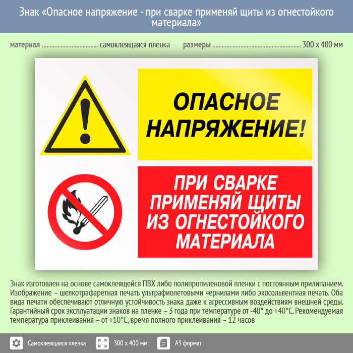 Знак «Опасное напряжение - при сварке применяй щиты из огнестойкого материала», КЗ-46 (пленка, 400х300 мм) в Москве купить