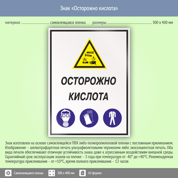 Знак «Осторожно кислота», КЗ-61 (пленка, 300х400 мм) в Москве купить