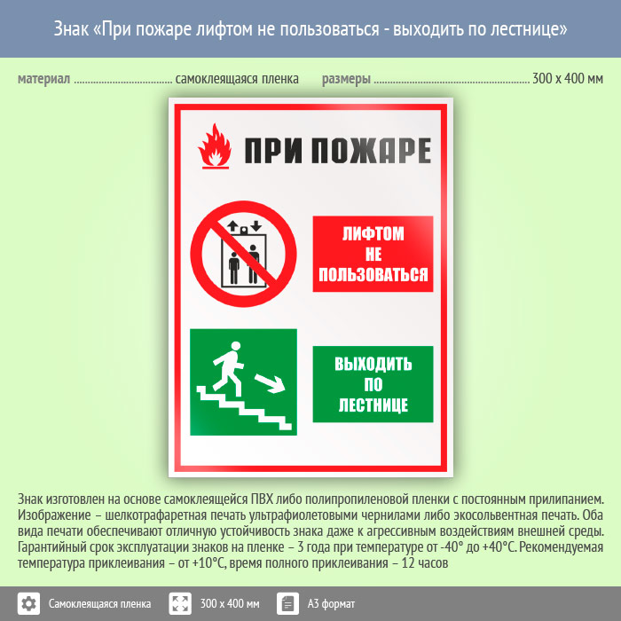 Знак «При пожаре лифтом не пользоваться - выходить по лестнице», КЗ-73 (пленка, 300х400 мм) в Москве купить