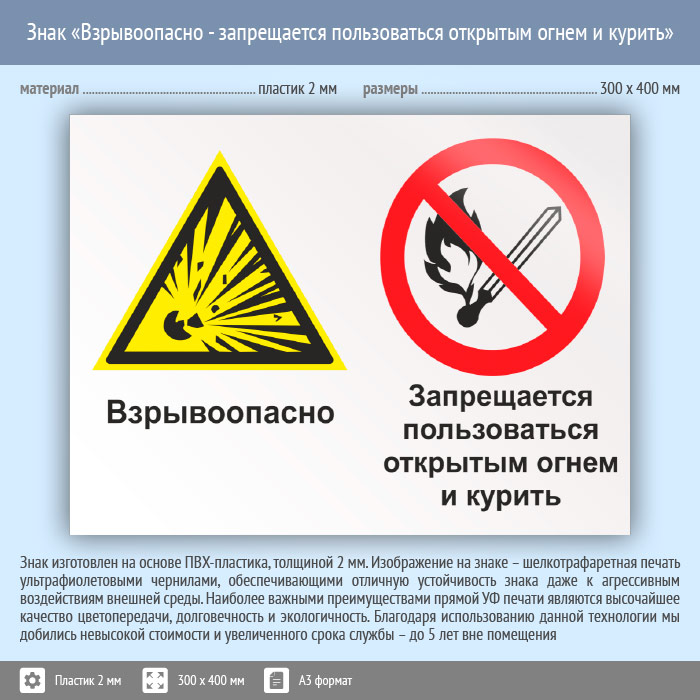 Знак «Взрывоопасно - запрещается пользоваться открытым огнем и курить», КЗ-07 (пластик, 400х300 мм) в Москве купить