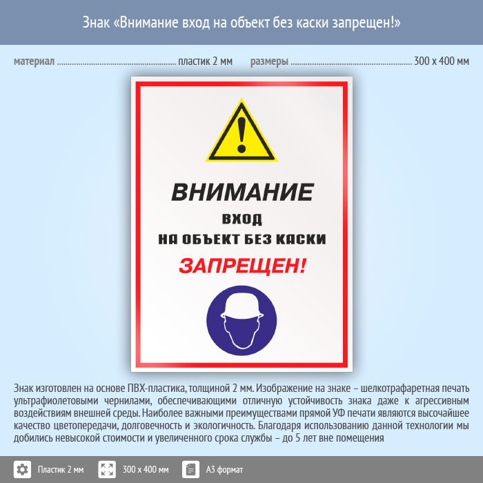 Знак «Внимание вход на объект без каски запрещен!», КЗ-13 (пластик, 300х400 мм) в Москве купить